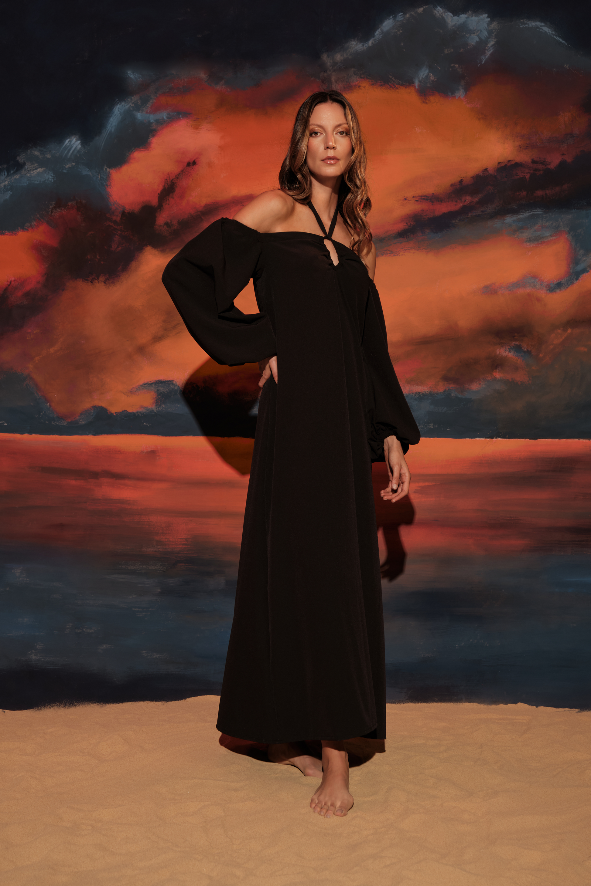 Descubre la esencia del glamour relajado con nuestro TUNIC DRESS. Este diseño incorpora un escote halter con corte en V y elegantes mangas caídas que enmarcan los hombros con sutileza. Confeccionado en tejido acanalado sin forro, ofrece un look fluido y fresco, ideal para días soleados o veladas en la playa.